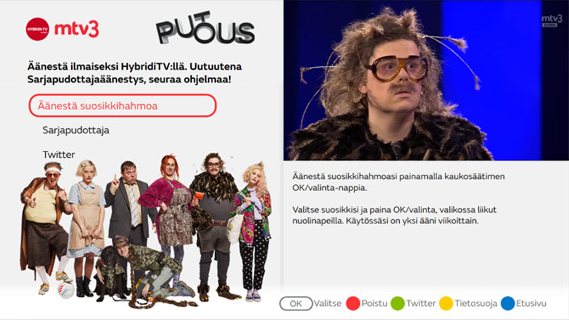 Director Teppo Ahonen from Digita commented: “Digita has worked a long time together with TV companies in developing different applications for Hybrid TV. One example of these is Hybrid TV voting, which is a result of its simple and apparent functionality in conjunction with a TV show. When you can vote for your own candidate for free using a remote controller button without other devices or applications, the threshold for voting is low”.